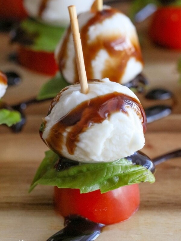 By adding mozzarella pearls and fresh basil, we’ve made it a one-bite tasty appetizer. They look extra fancy but are still SO easy to assemble. We’ve included step-by-step photos and instructions to ensure your success.