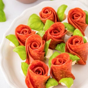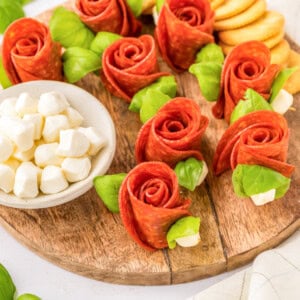 We love to add Pepperoni Roses or Salami Roses to our Charcuterie spreads (they really add a touch of elegance). We took that same idea and made bite-size pepperoni rose skewers that are beautiful and delicious!