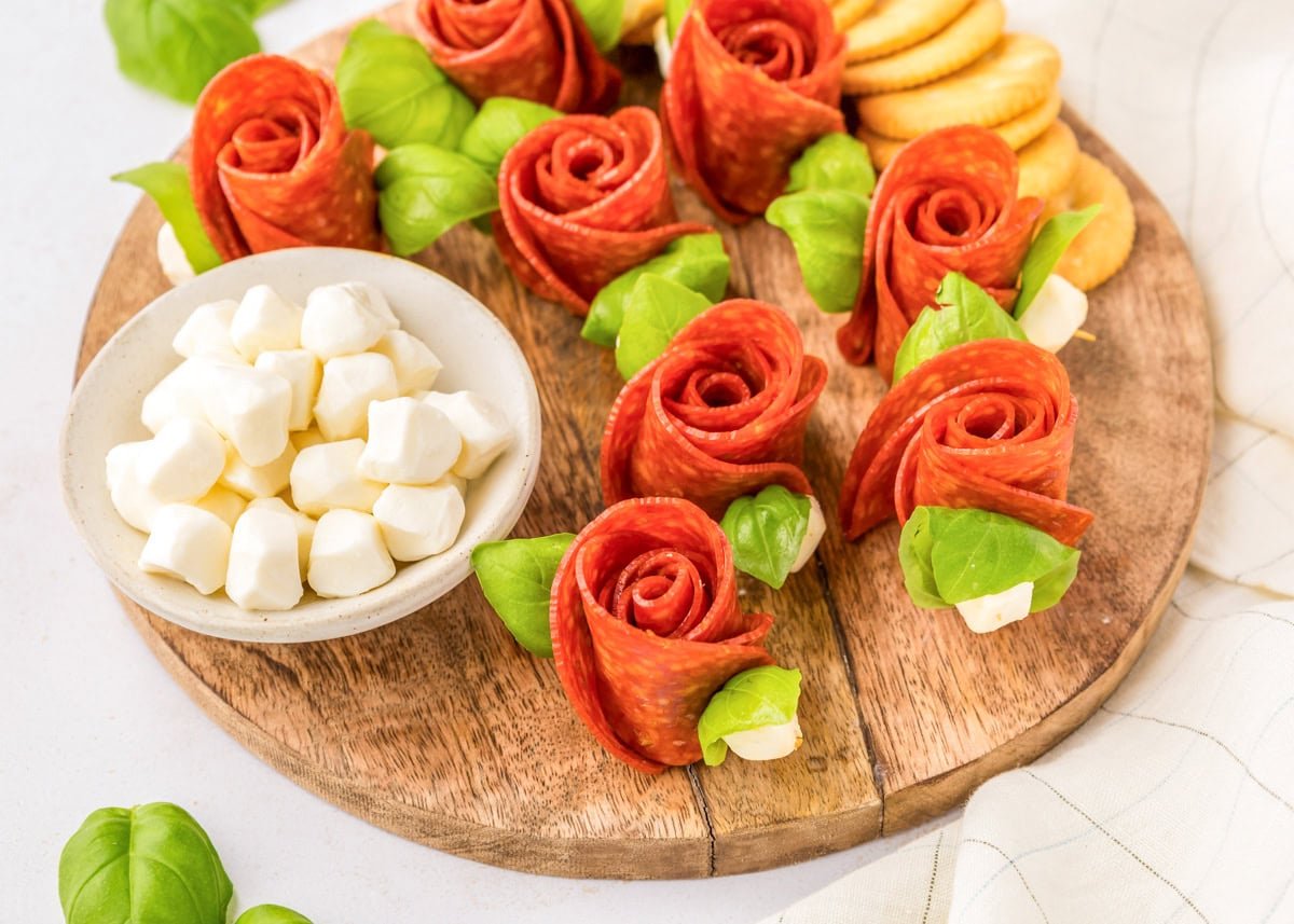 - ROSES. Take 4 slices of pepperoni, or slices of salami, and layer them halfway over each other on a flat surface. Fold them over in half, pressing as you fold. Then, start rolling them up from the edge until it is all rolled up. Insert a long toothpick or small wooden skewer through the center of the rose.
